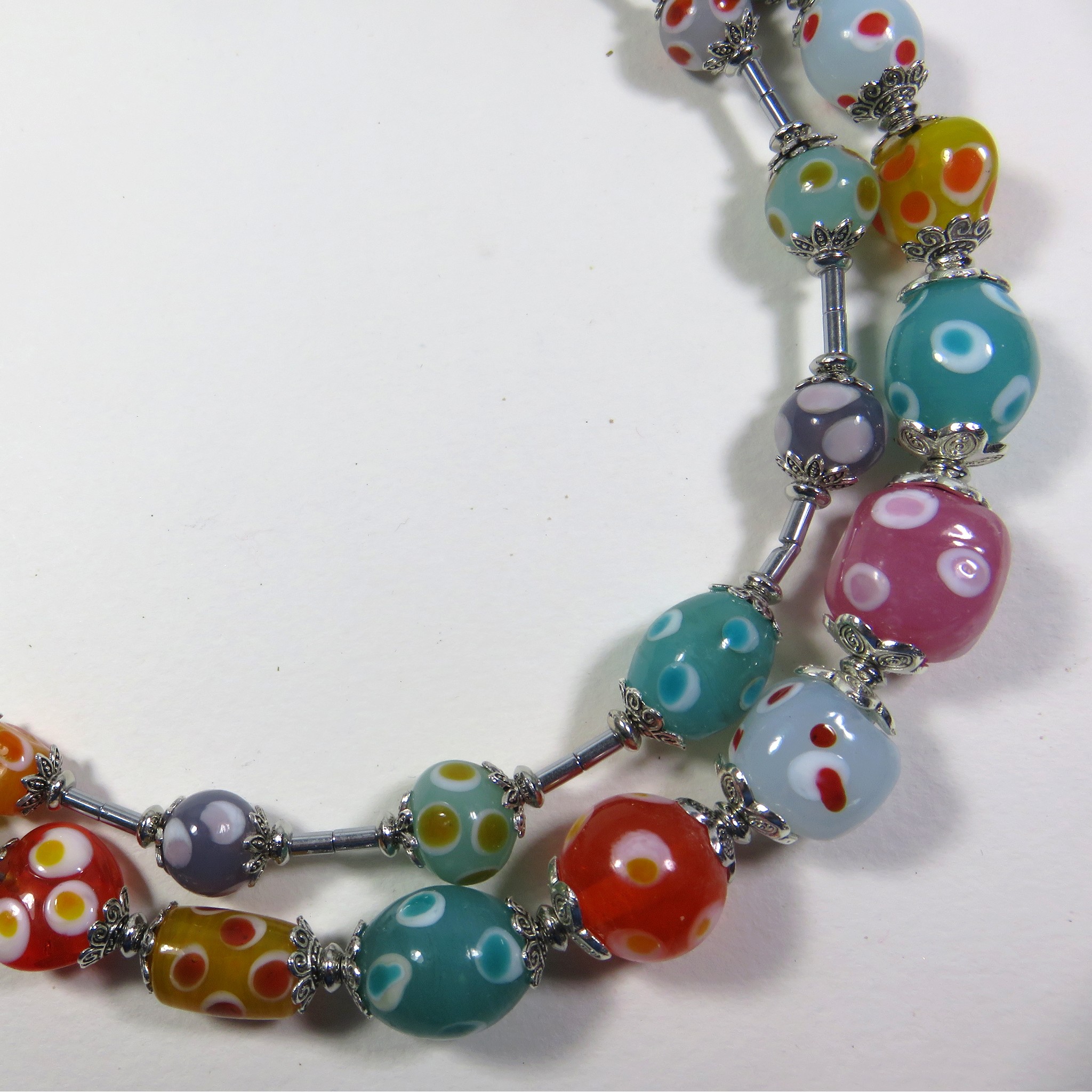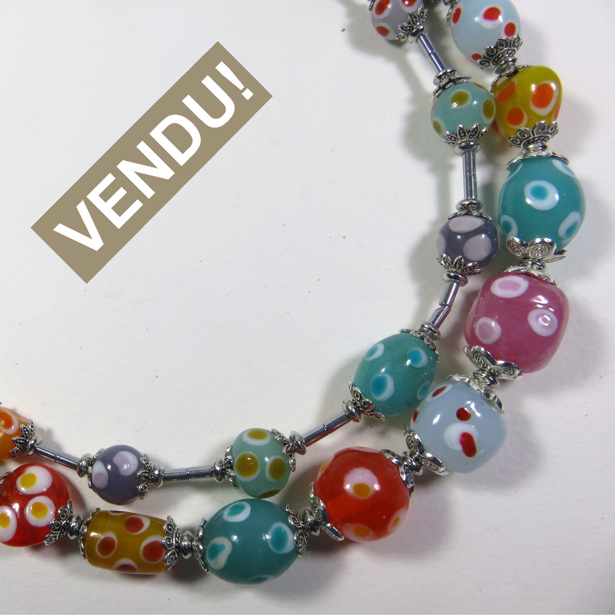 Ce collier double rang est orné de perles bonbons aux douces nuances multicolores en verre filé artisanal et d’hématite argent. Fermoir mousqueton en métal argenté et chaînette de réglage. Longueur 42/45cm (les longueurs sont données à titre indicatif et peuvent être modifiées). Poids g. Bijou neuf réalisé en pièce unique estampillé « Sarah Luna ». Ref: SL/773.