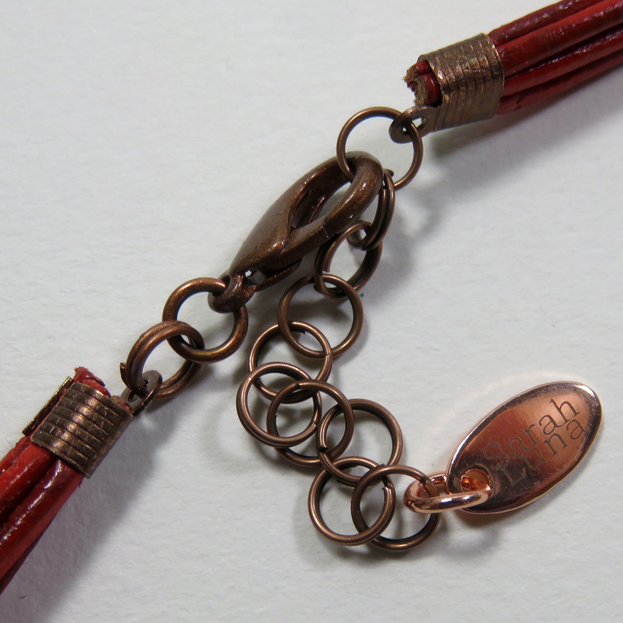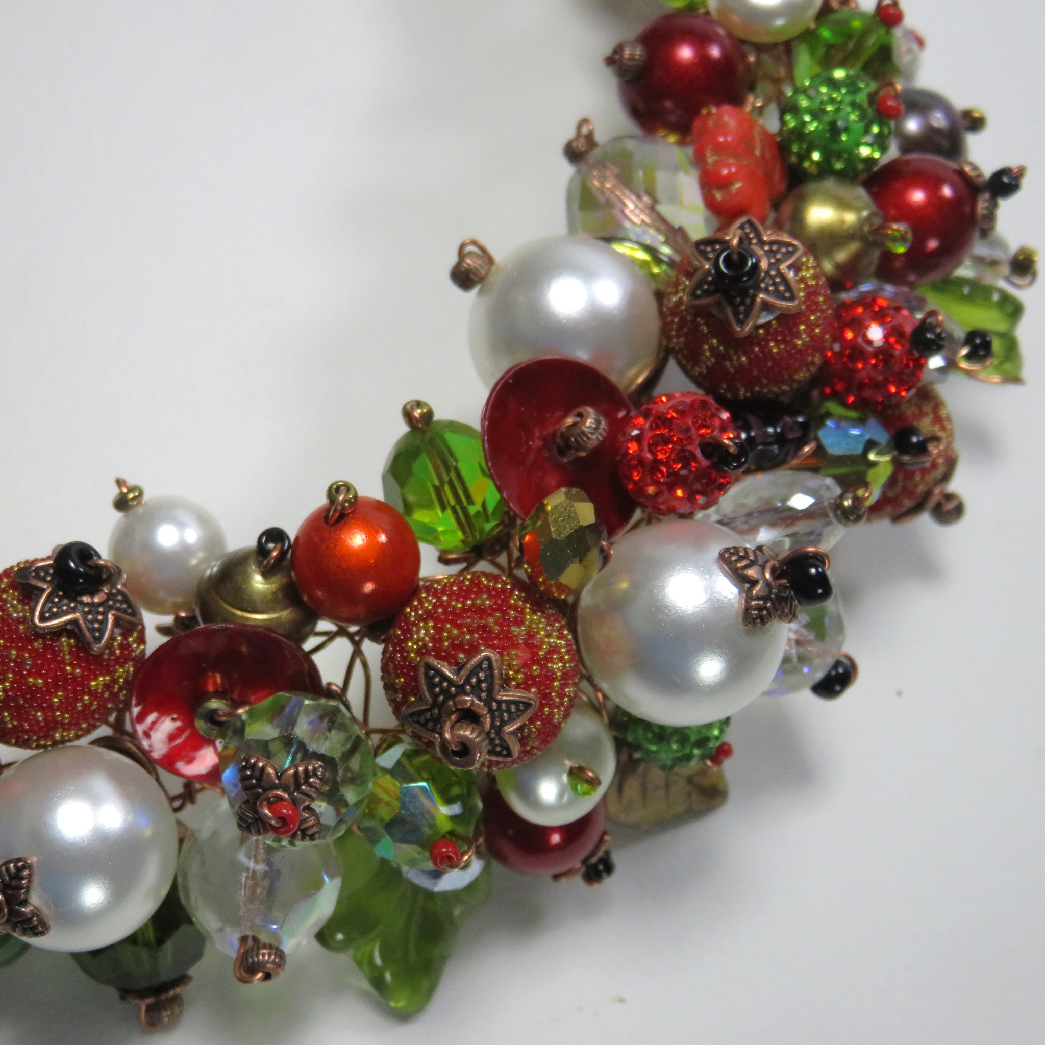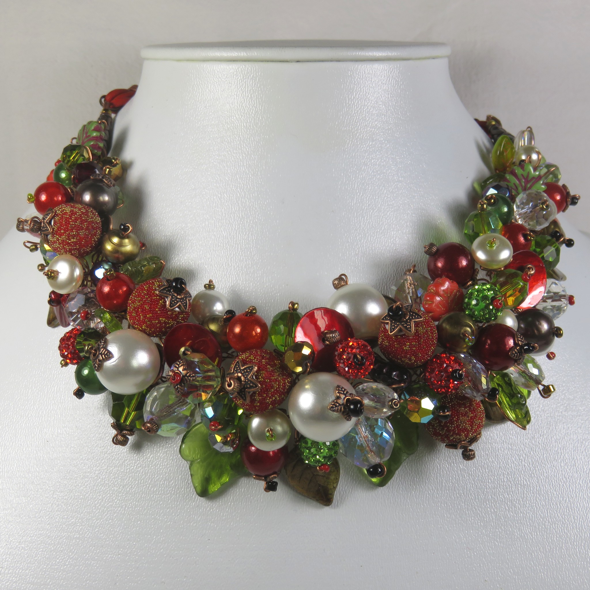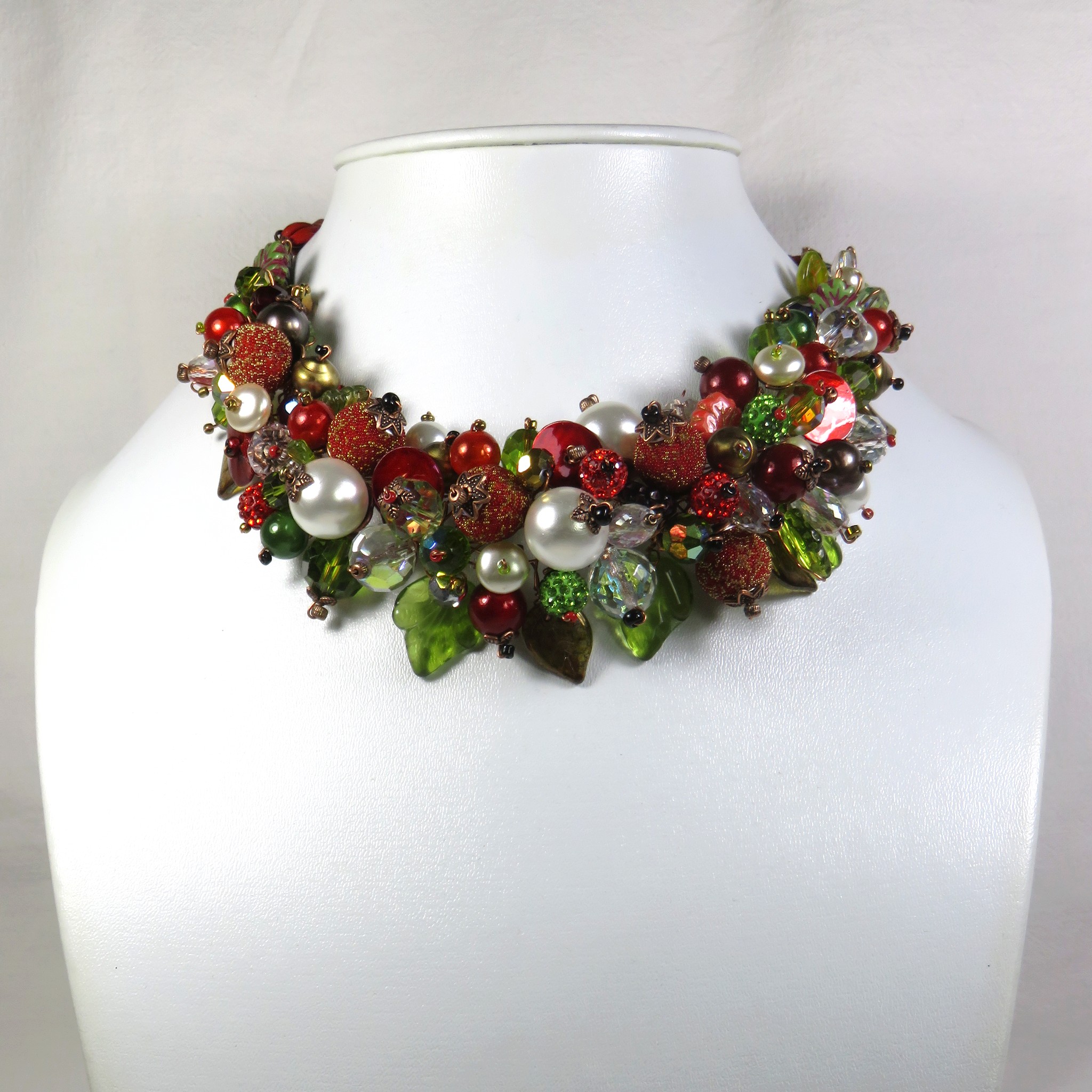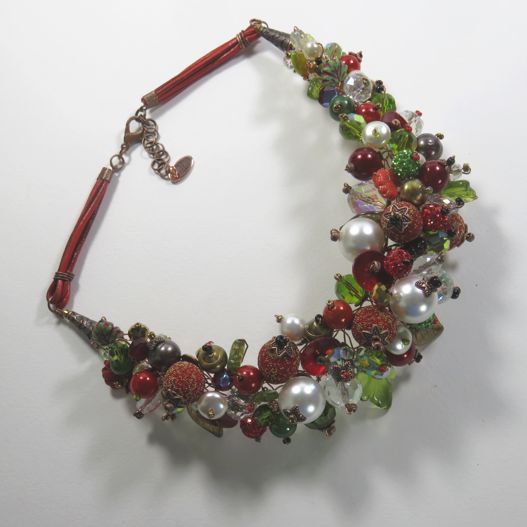 Un éblouissant collier branche de fruits et de feuilles aux couleurs de Noël, composé d’un tissage de fil de laiton cuivré, orné de grosses perles nacrées et de résine granitée rouge, de cristal irisé et de feuillage en verre artisanal de Bohème, et de nacre rouge. Il est imposant et très habillé, mais léger et ne « pique » pas! Pour le confort, le dos est composé d’un lacet de cuir couleur rouge. Fermoir mousqueton en métal cuivré et chaînette de réglage. Longueur 43/48 cm (les longueurs sont données à titre indicatif et peuvent être modifiées). Poids g. Bijou neuf réalisé en pièce unique estampillé « Sarah Luna ». Ref: SL/762.