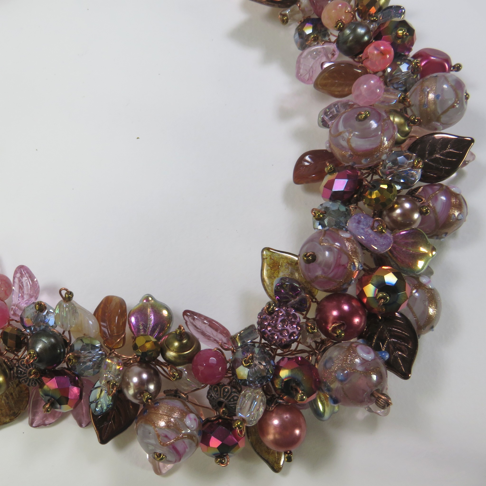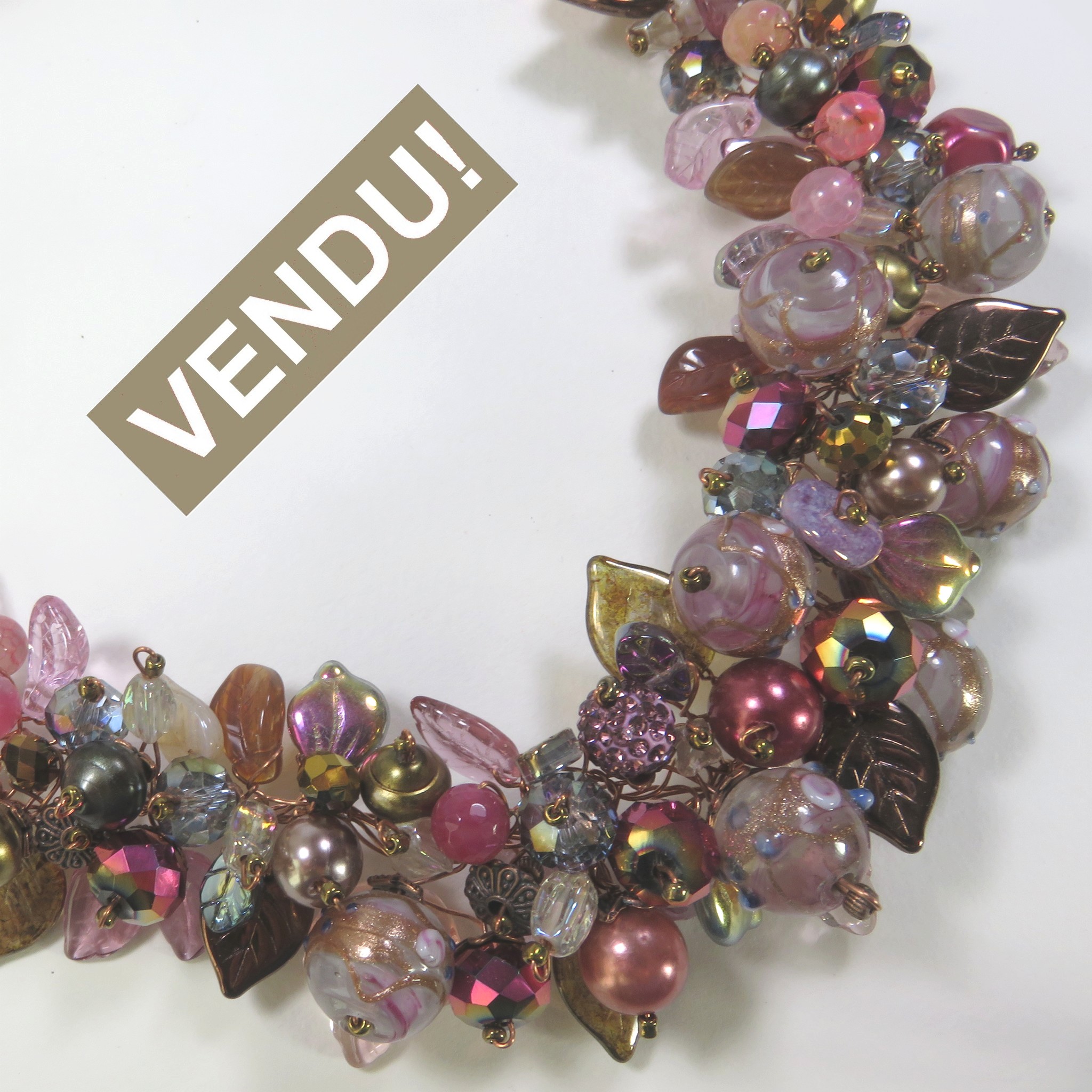 Ce collier plastron touffu comme une branche de feuilles et de fleurs, est composé d’un tissage de fil de laiton cuivré, orné de perles rose et or en verre filé de Murano, de feuillage en verre pressé de Bohème dans un camaïeu de rose et mordoré, et de cristal de Bohème irisé. Il est imposant et très habillé, mais léger et ne « pique » pas! Le dos est composé d’un lacet de cuir couleur bronze pour le confort. Fermoir mousqueton en métal cuivré et chaînette de réglage. Longueur / cm (les longueurs sont données à titre indicatif et peuvent être modifiées). Poids g. Bijou neuf réalisé en pièce unique estampillé « Sarah Luna ». Ref: SL/761.