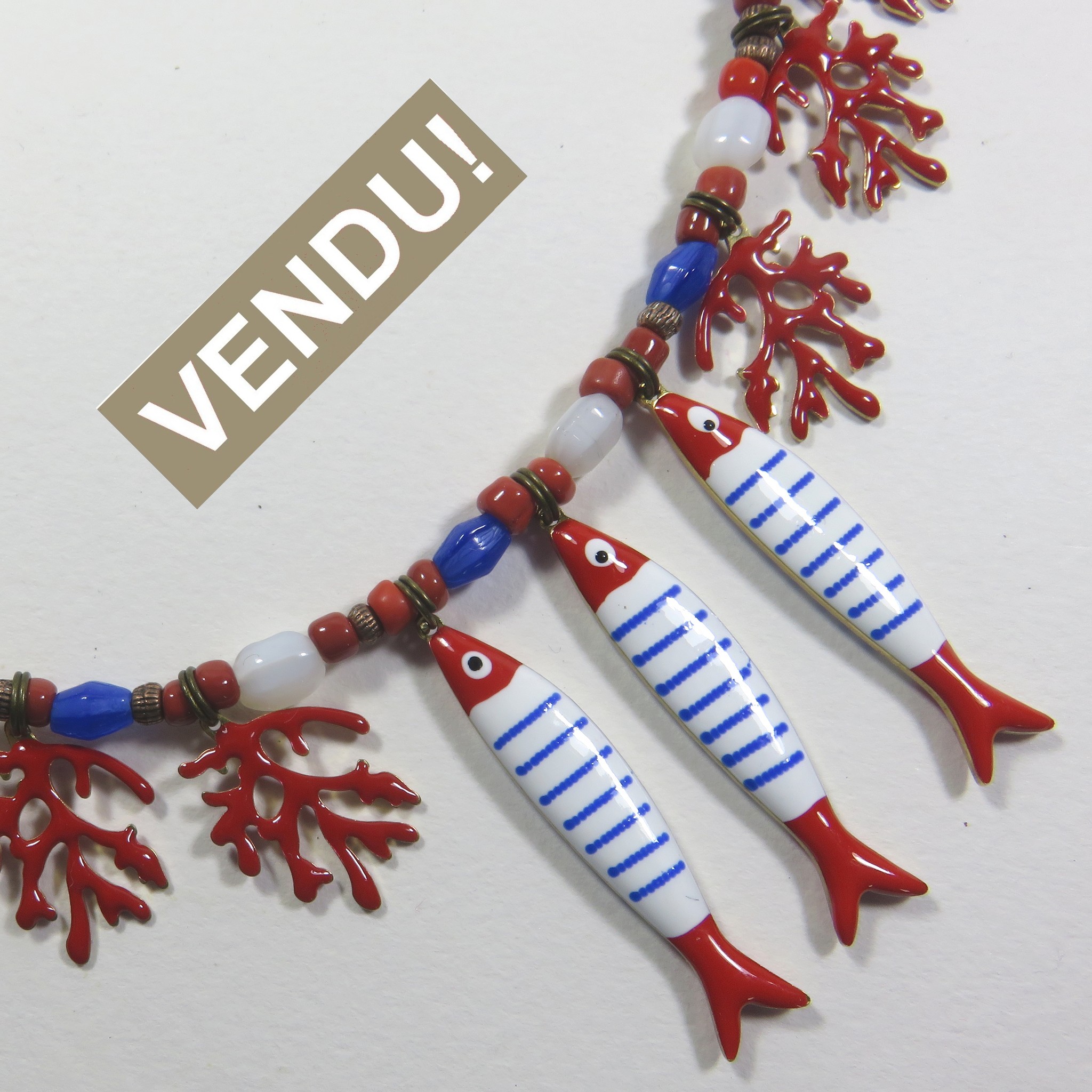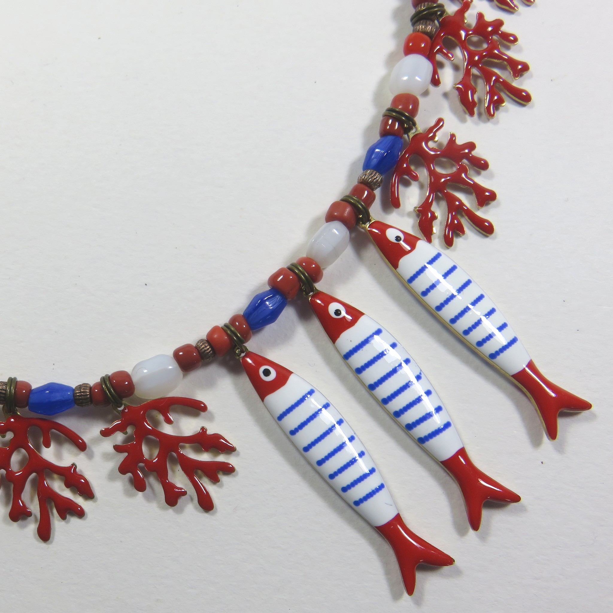 Sur ce collier tout simple, des poissons émaillés  blanc bleu et rouge et des breloques émaillées rouge, accompagnés de perles de cristal bleu blanc et rouge, sur hématite mordorée. Fermoir mousqueton en métal bronze et chaînette de réglage. Longueur 42/45cm (les longueurs sont données à titre indicatif et peuvent être modifiées). Poids g. Bijou neuf réalisé en pièce unique estampillé « Sarah Luna ». Ref: SL/770.