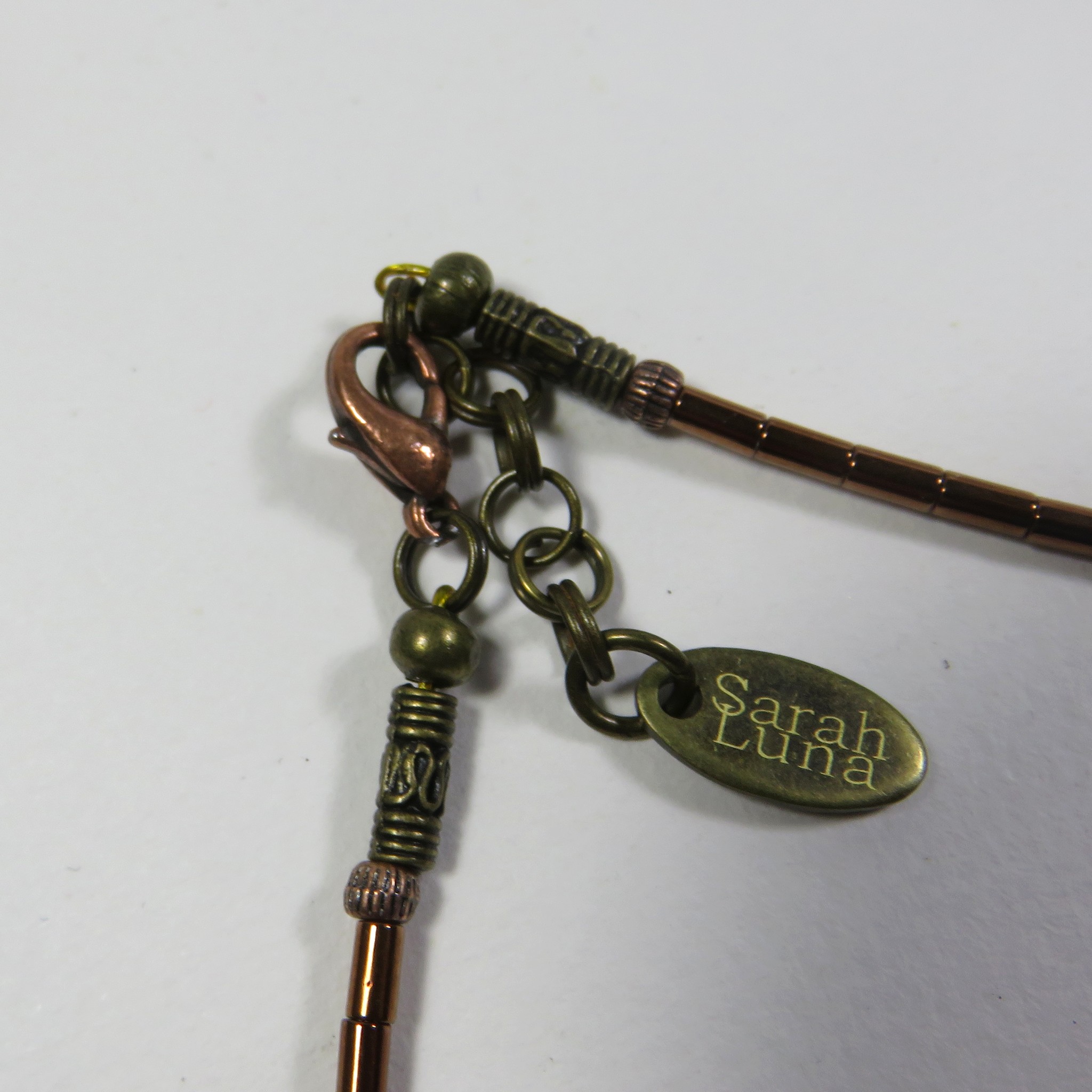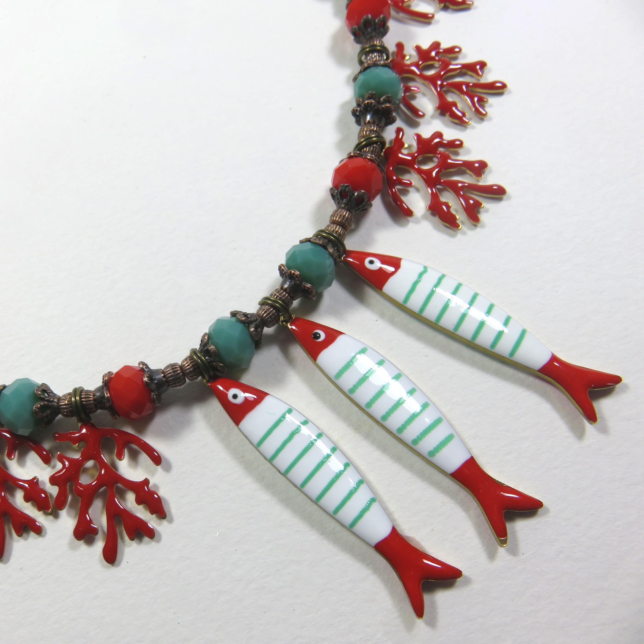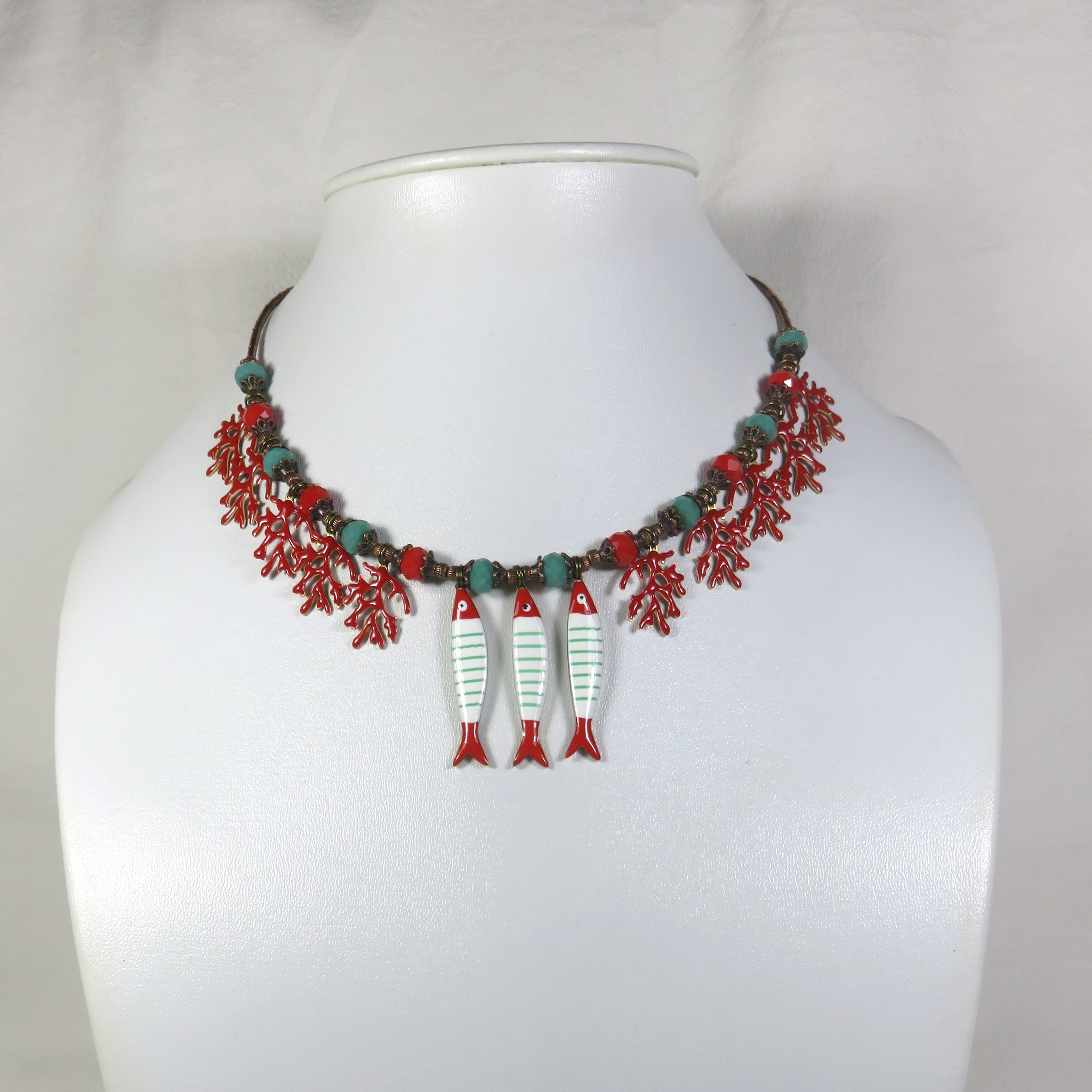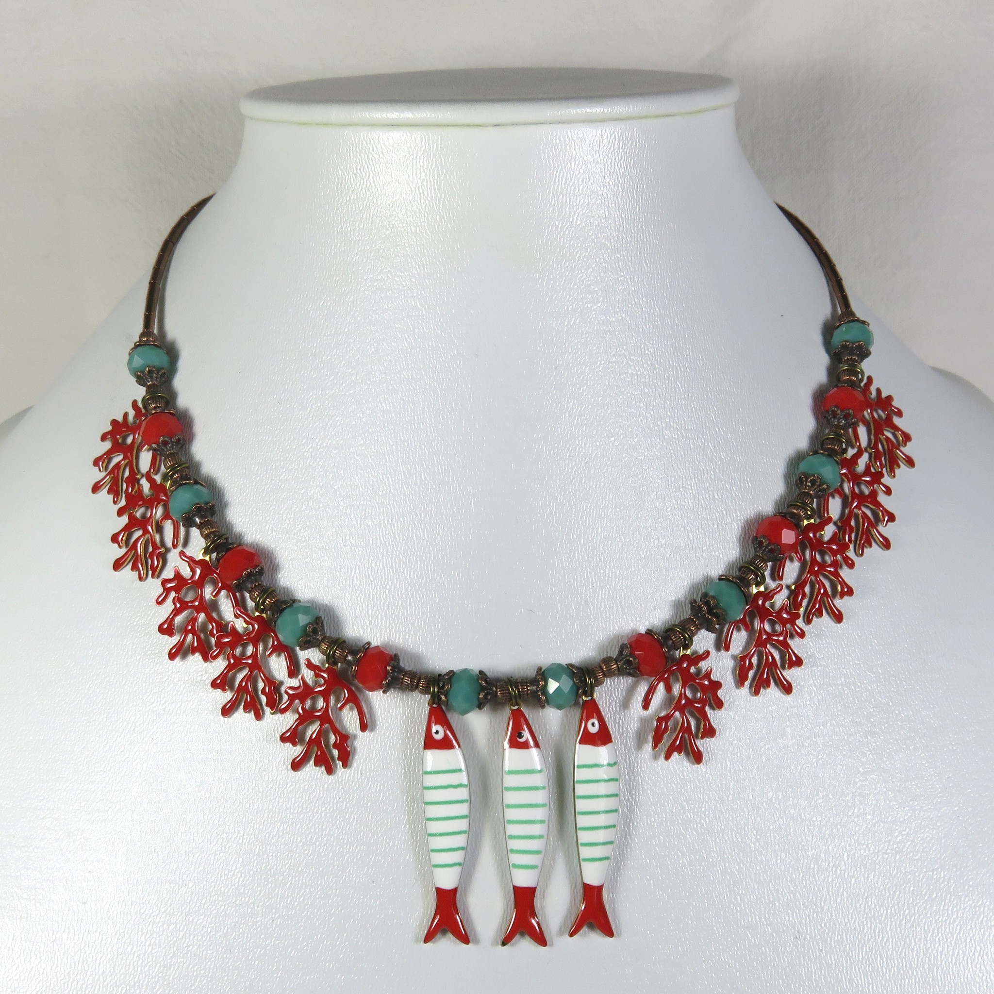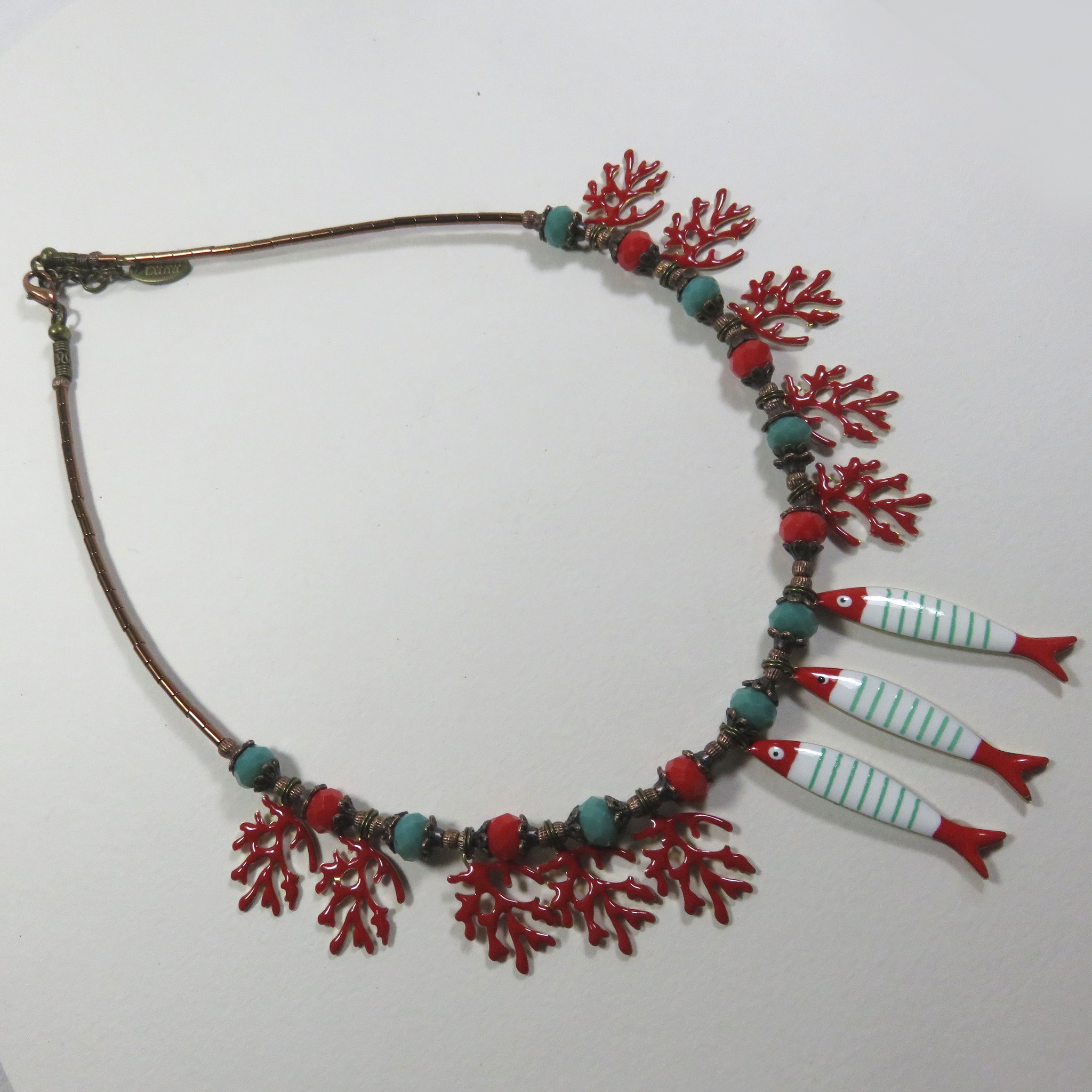 Sur ce collier tout simple, des poissons et coraux de métal émaillé rouge turquoise et blanc, des perles de cristal turquoise et rouge et de laiton bronze, sur hématite bronze. Fermoir mousqueton en métal bronze et chaînette de réglage. Longueur 43/48cm (les longueurs sont données à titre indicatif et peuvent être modifiées). Poids g. Bijou neuf réalisé en pièce unique estampillé « Sarah Luna ». Ref:SL/769.