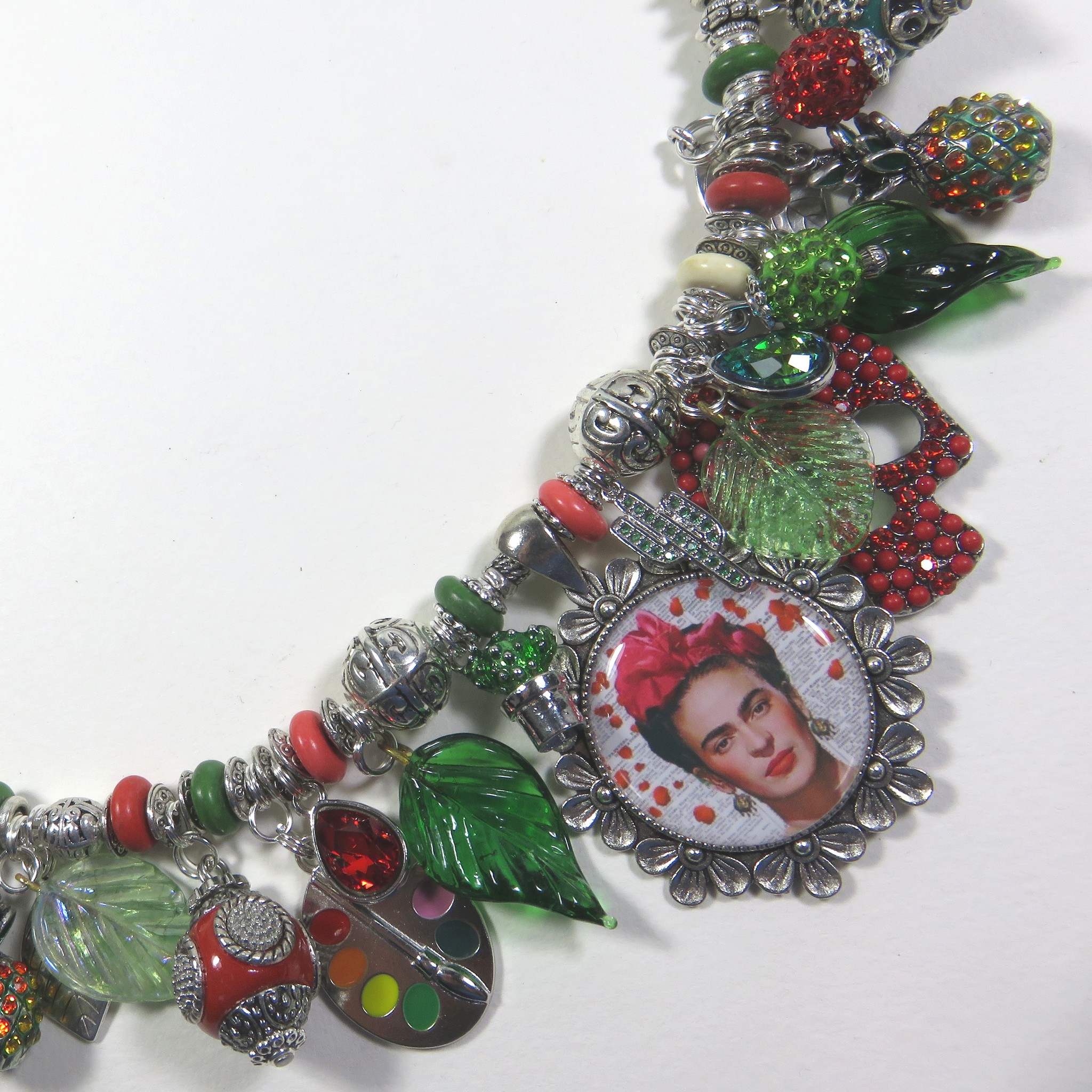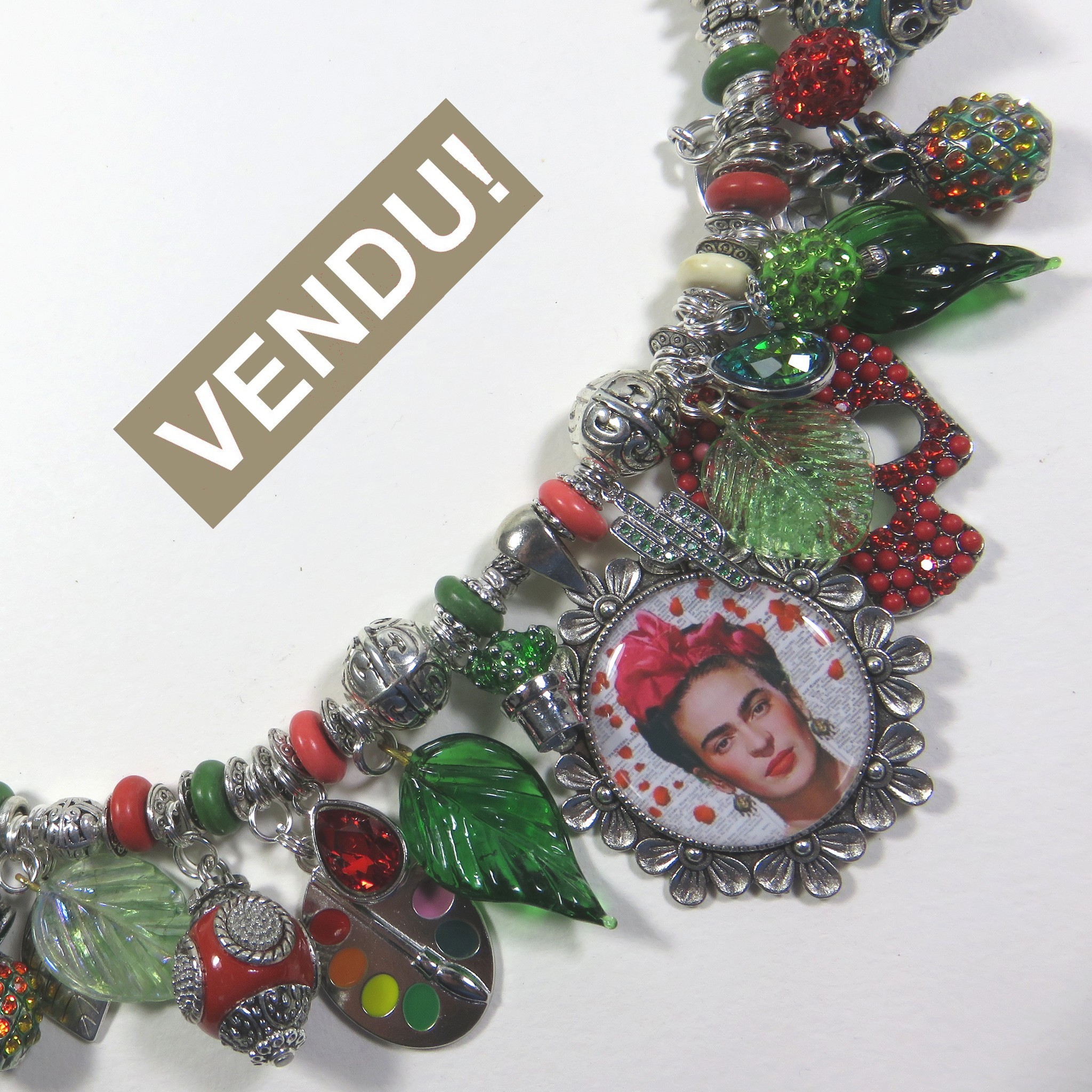 Autour d’un portrait-photo de la peintre mexicaine Frida Kahlo (1907-1954), une profusion de breloques émaillées ou strass pour évoquer les thèmes récurrents de son oeuvre: la vie, la peinture, la nature, les animaux, l’amour, la mort… Sur hématite argent, fermoir mousqueton en métal argenté et chaînette de réglage. Longueur 44/48cm (les longueurs sont données à titre indicatif et peuvent être modifiées). Poids g. Bijou neuf réalisé en pièce unique estampillé « Sarah Luna ». SL/772