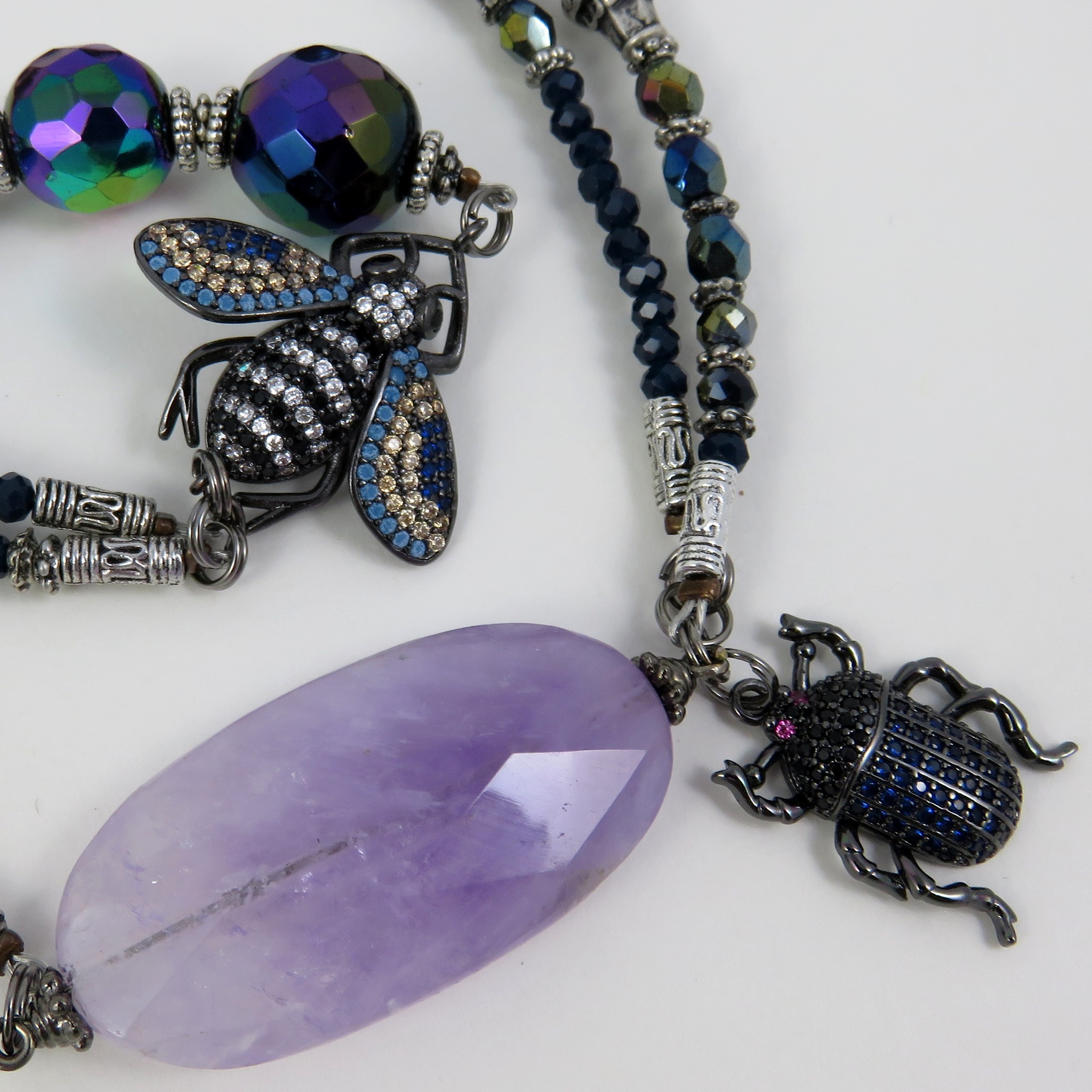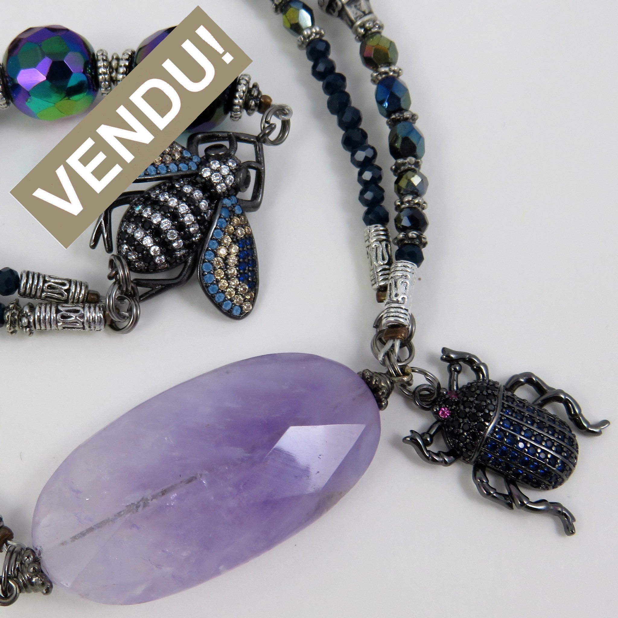 Collier chic et original avec sa somptueuse améthiste, accompagnée de perles anciennes et d’insectes en strass